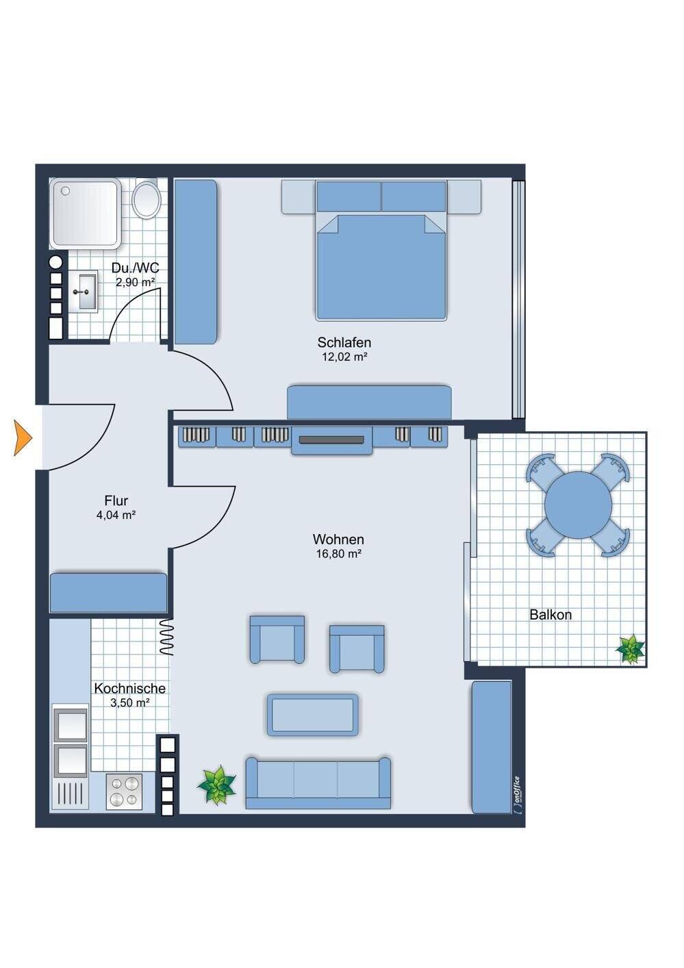 Der helle Wohnbereich mit Zugang zum sonnigen Süd-West-Balkon lädt zum Entspannen ein, während das geräumige Schlafzimmer genügend Platz für individuelle Einrichtungsideen bietet. Die separate Kochnische ist mit einer modernen Einbauküche inklusive Elektrogeräten ausgestattet, und das gepflegte Badezimmer verfügt über eine Dusche und WC. Praktisch ergänzt wird die Wohnung durch die Diele mit einem geräumigen Einbauschrank, der zusätzlichen Stauraum schafft.