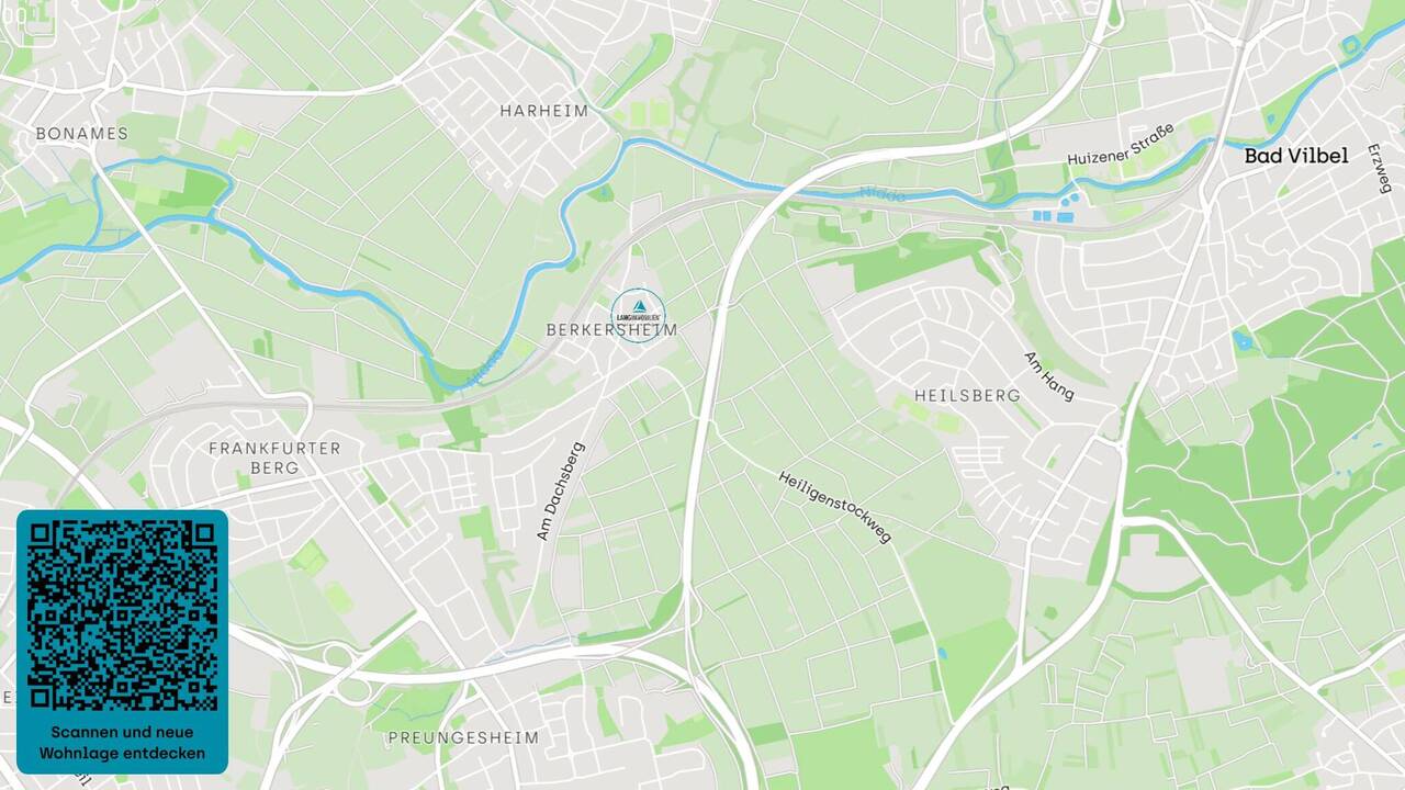 Das Haus liegt in einer ruhigen Wohngegend von Berkersheim und bietet eine gute Anbindung an öffentliche Verkehrsmittel sowie Einkaufsmöglichkeiten. Der Bahnhof Berkersheim liegt nur 5-6 Gehminuten entfernt und schafft mit der S6 eine hervorragende Anbindung an das Frankfurter Stadtgebiet.