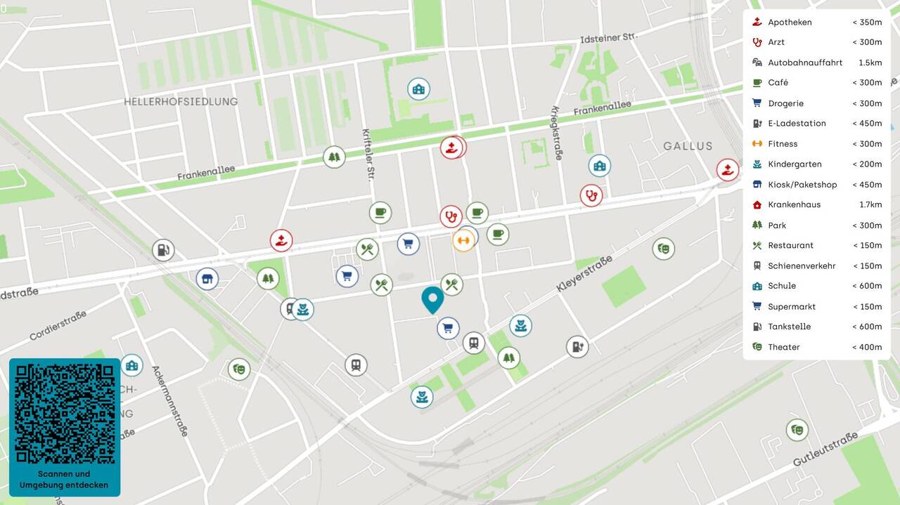 • S-Bahn-Station „Galluswarte“ (S3, S4, S5, S6) in ca. 10 Min. fußläufig erreichbar